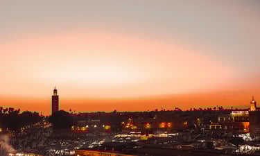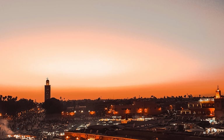 A farewell dinner at a luxury rooftop Riad, watching the Koutoubia Mosque light up as the sun sets over Marrakech.